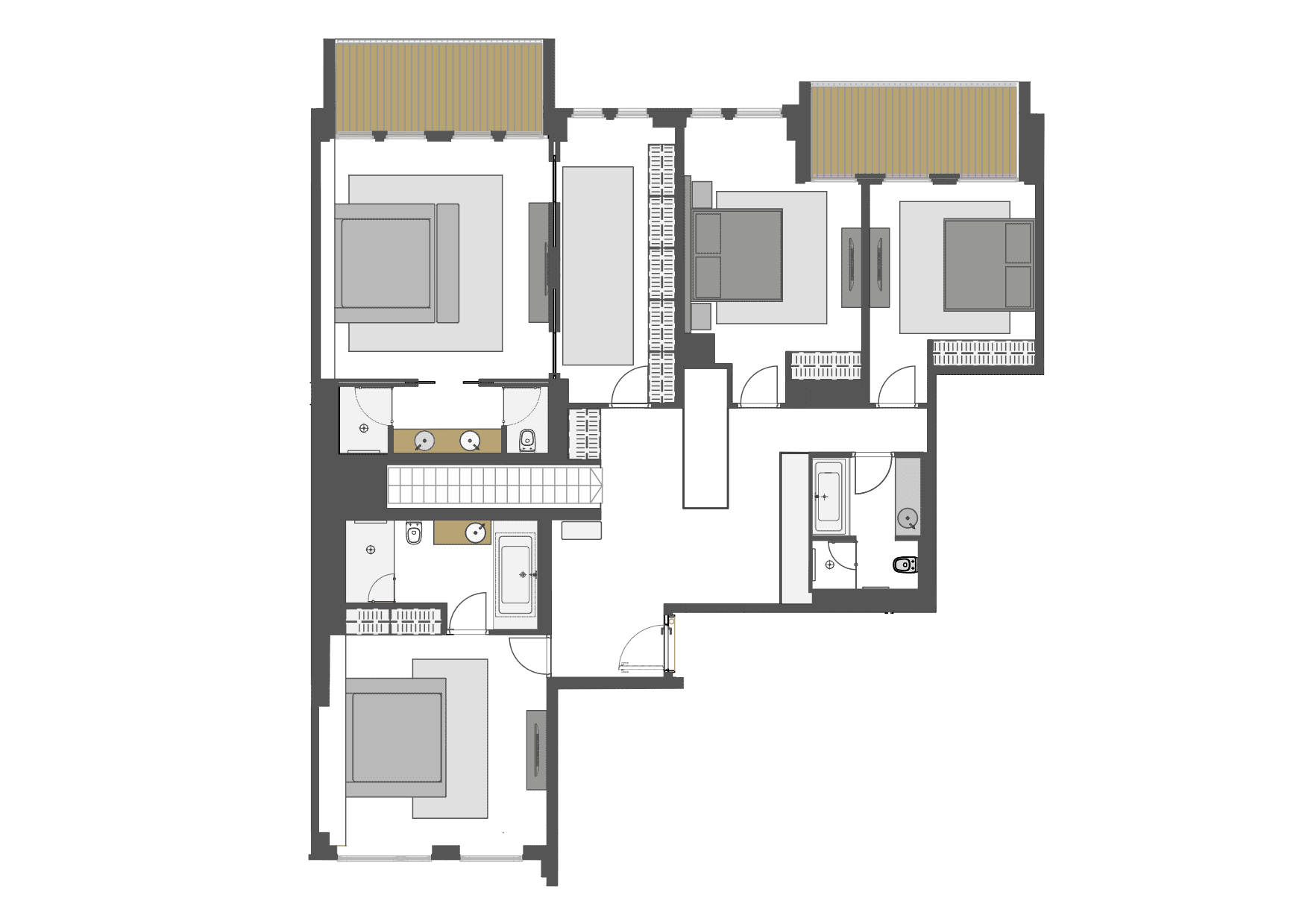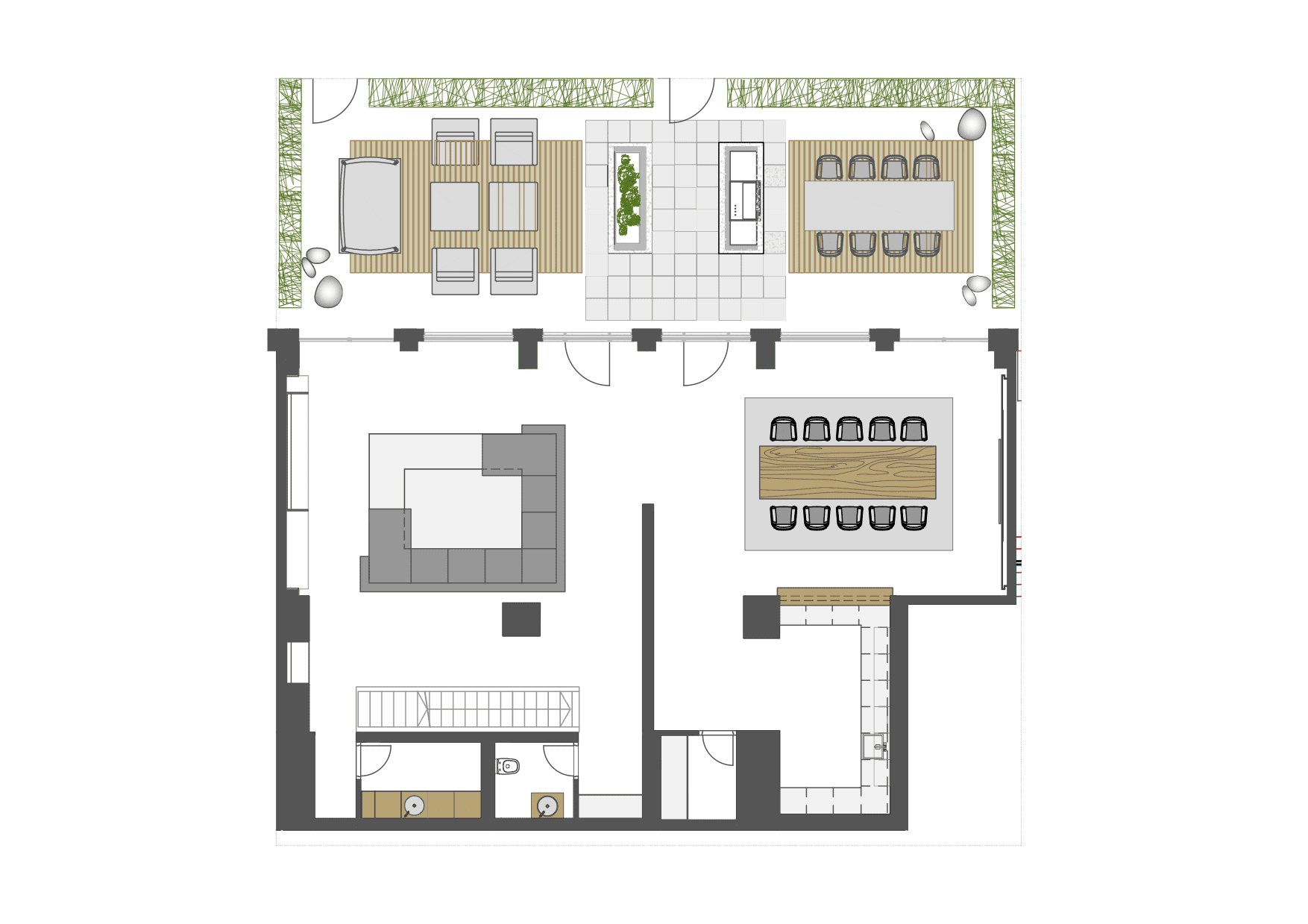 Kuna algselt oli tegemist kahe eraldi koreriga, siis meie ülesandeks oli need ühendada nii, et tekiks suur luksuslik linnakorter võimalusega, et neid saab kunagi veel soovikorral eraldada. Selle võimaluse tagamiseks on eraldi voolumõõtjad ja peidetud kommunikatsioonid teise köögi jaoks. Alles on ka võimalus teise trepi jaoks (kuna mõlemad korterid on läbi kahe korruse) – praegu on teine trepiava kunsti teenima pandud – II korruse lakke on kinnitaud minu projekteeritud poleeritud roostevabast terasest pendel, mis joonistab I korruse põrandal oleva süvise sisse pandud valge marmorliiva sisse kaarjaid jooni. Selle meie joaks väga erilise detaili valmistas ja aitas tehnilises osas lahendada skulptor Kalle Pruuden.