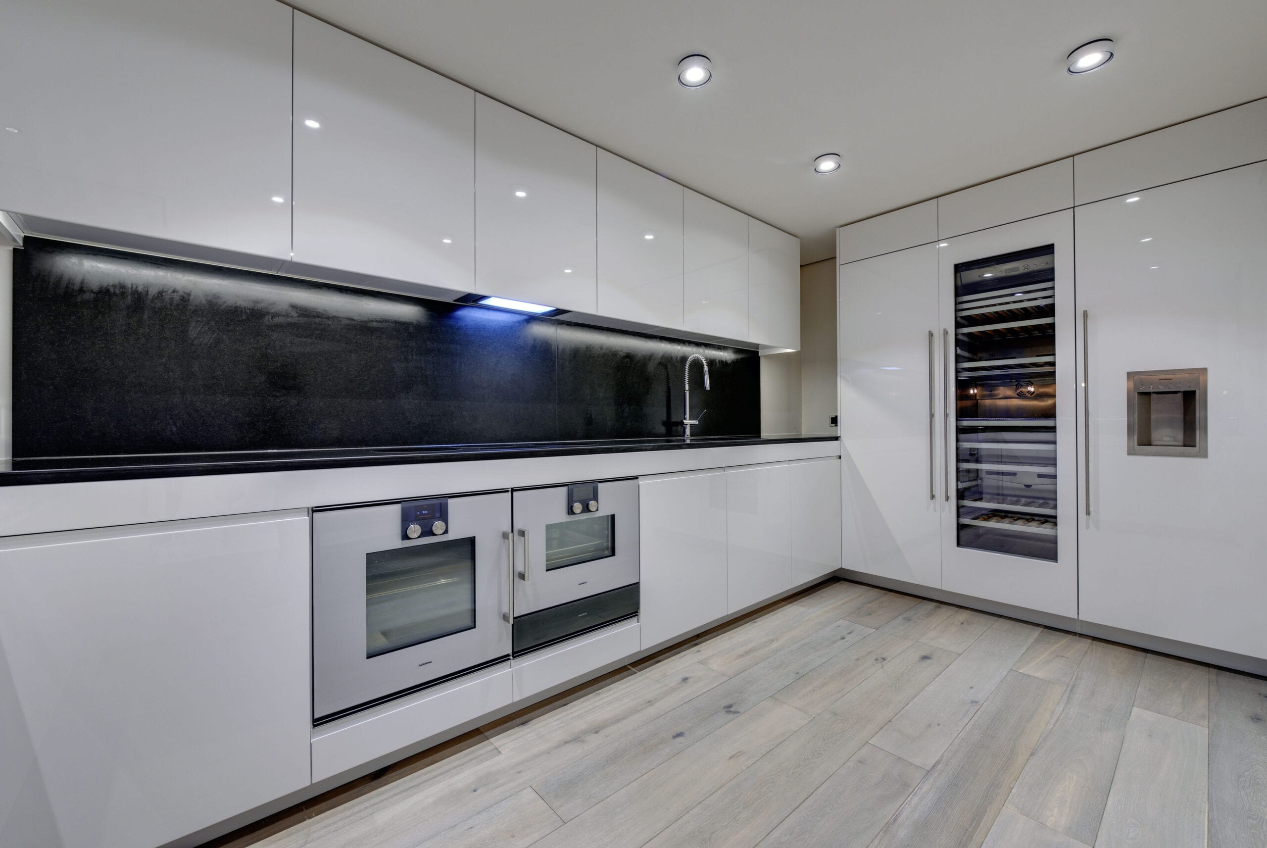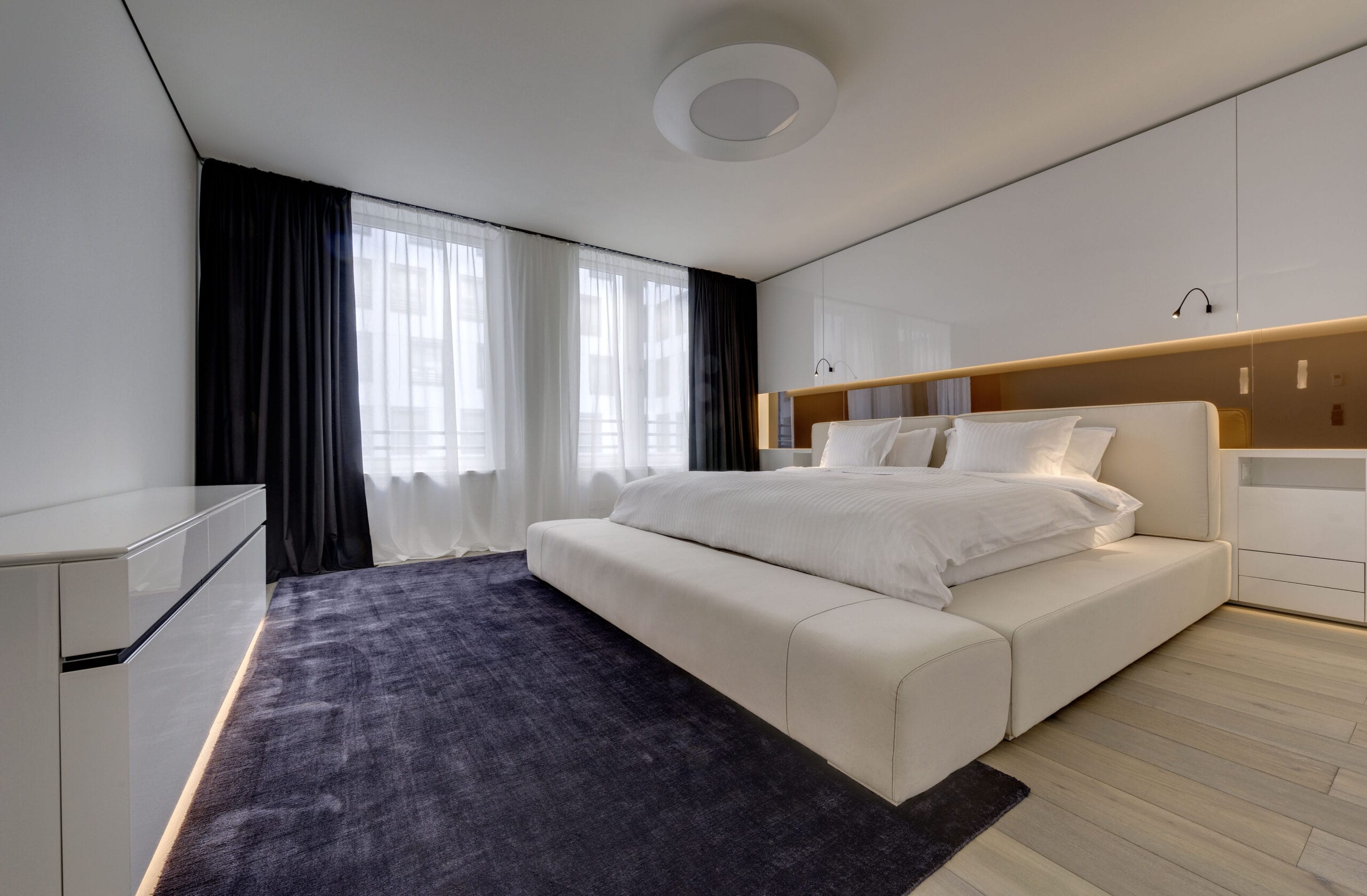 Olulismad elemendid on eritellimusel valminud kõrgläikeviimistlusega valged seinapaneelid ja ruumikõrgused uksed; integreeritud TV ja kaminaga meediasein ning põrandasüvisega lounge-ala, mis oligi järjekordne huvitav ülesanne ja väljakutse selle kauni korteri projekteerimisel. Põrandas on 700 mm sügav süvis, mis on elutoa põrandatasandist allpool, et tagada kõrvaloleva SPA ja basseiniala kommunikatsioonidele ligipääs. Meie kasutasime selle süvise diivani jaoks – annab huvitava nüansi ja lisab niigi kõrgele ruumile visuaalset avarust juurdegi.
