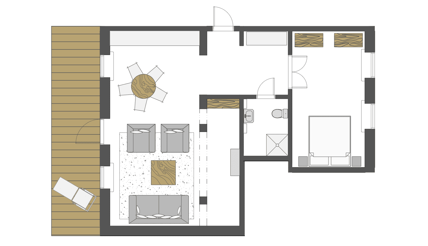 Kahetoaline korter asub maja esimesel korrusel ja on imelise merevaatega terrassiga. Korteri sisekujunduses on lähtutud nii hoone asukohast ja eripärast kui ka muinsuskaitse eritingimuste ettekirjutustest.