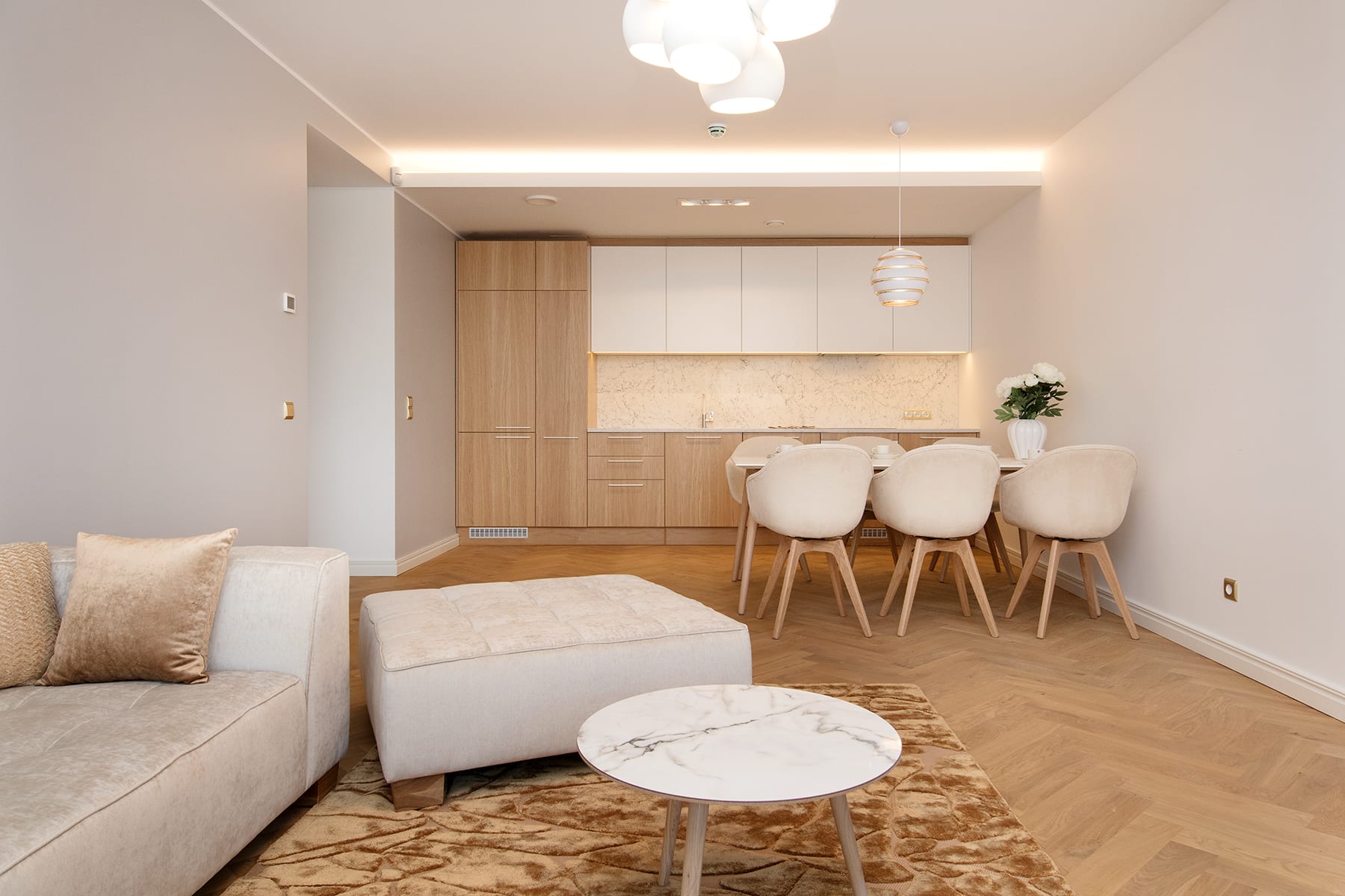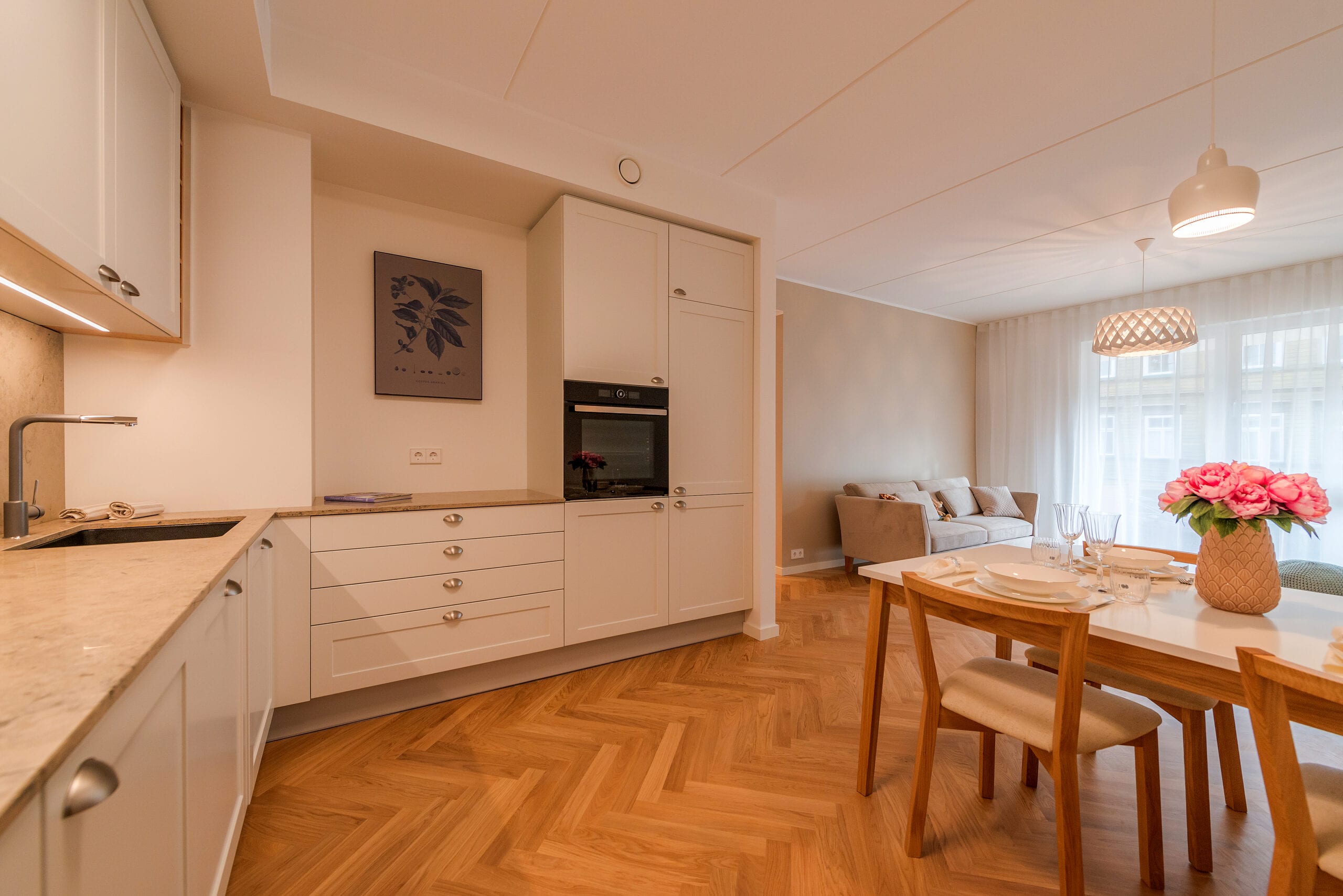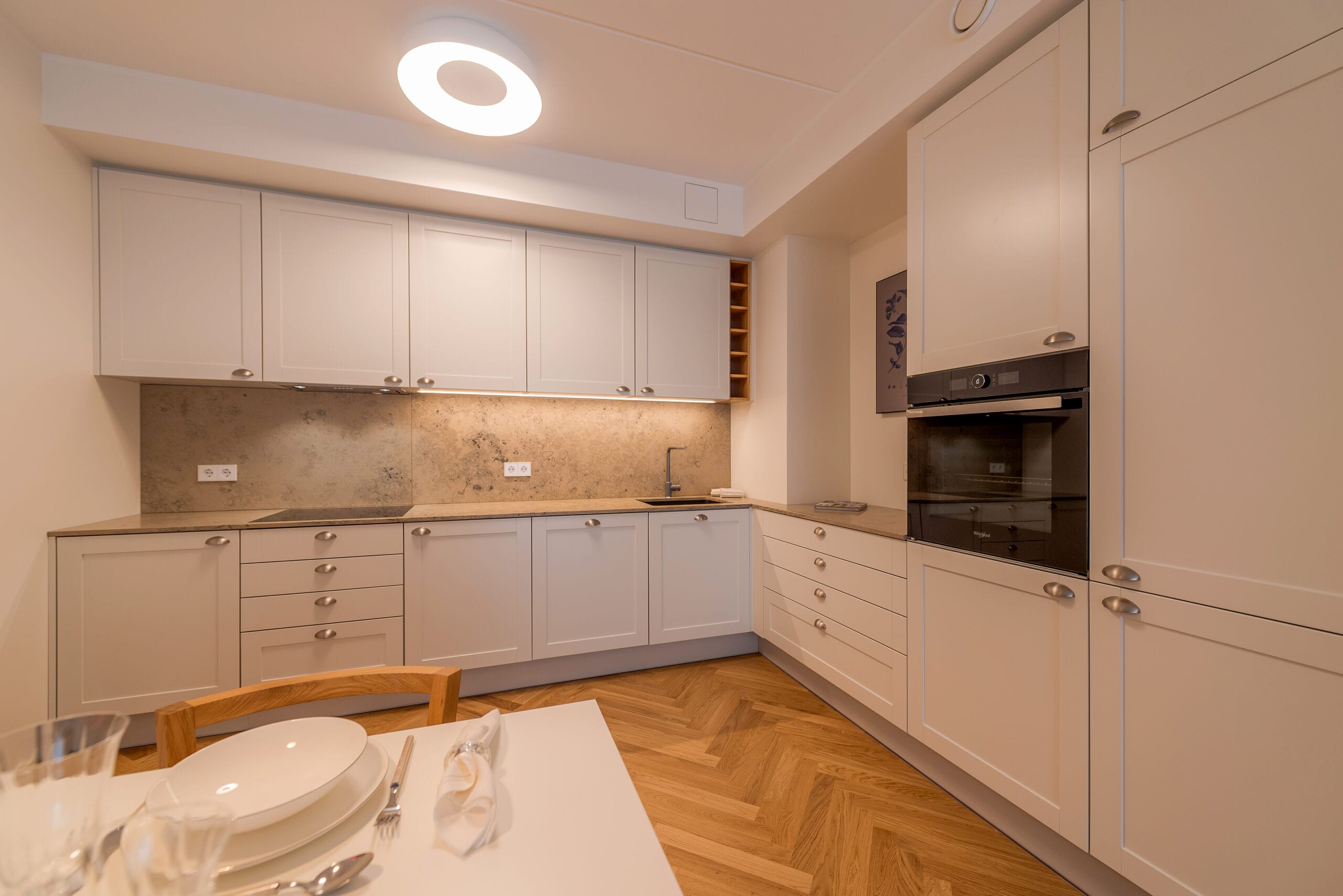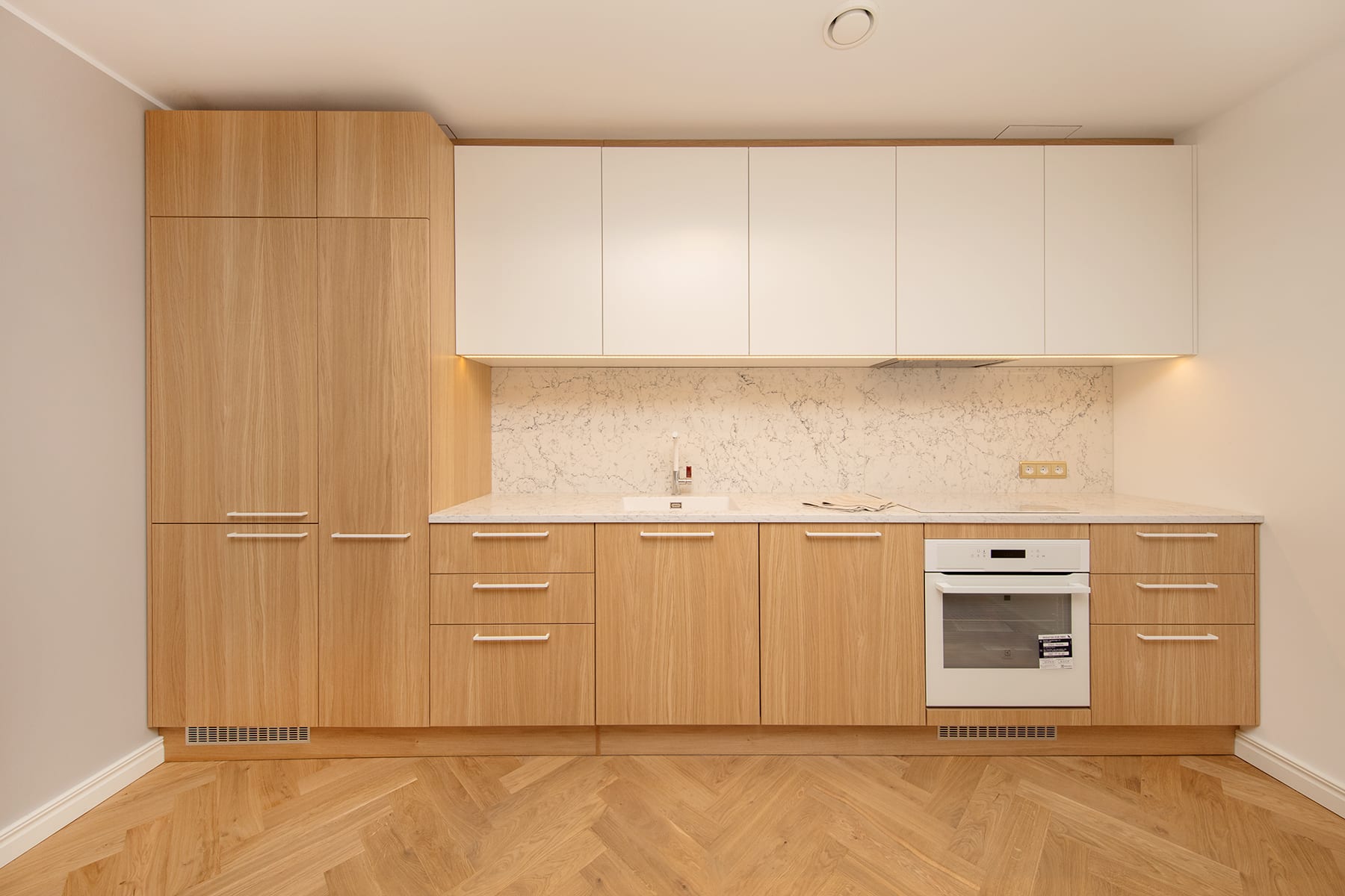 tammespooniga uksed, valged käepidemed, valge köögitehnika; kunstmarmorist tööpind; tootja: Nobe Interiors