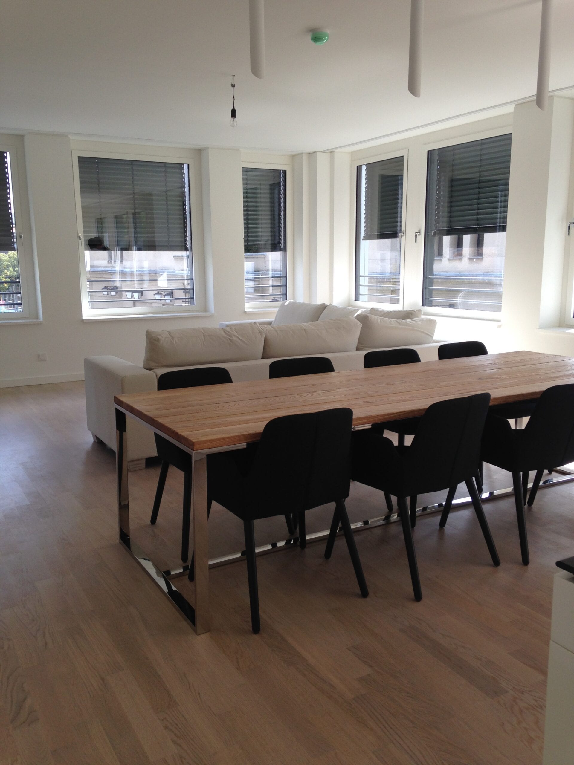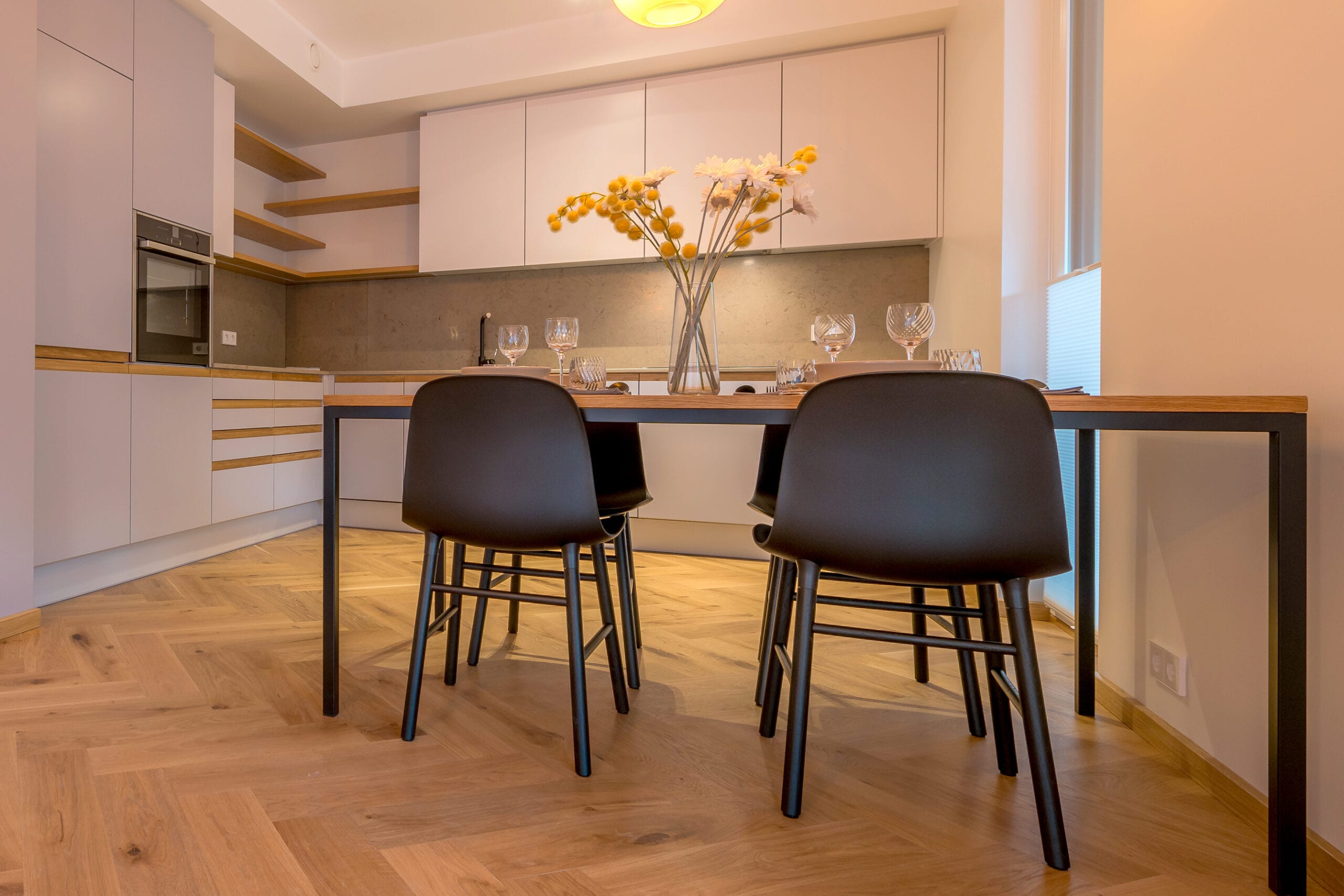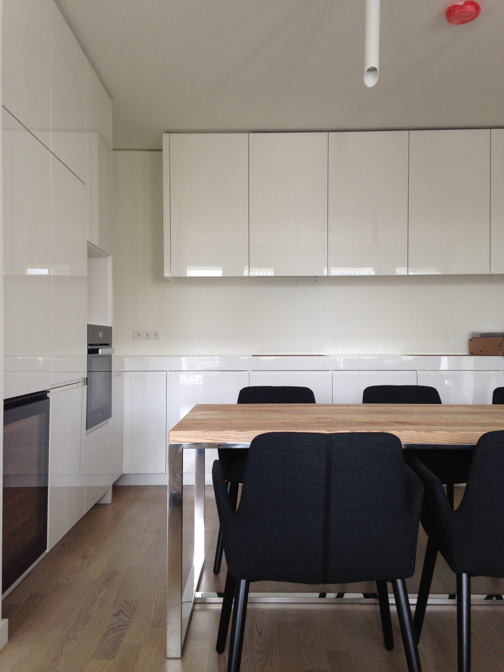 köögi valged kõrgläike värviga uksepinnad ja matt must looduskivist tööpind; söögilaud vanutatud tammelauad ja poleeritud roostevaba terasest jalaraam; tootja: Nobe Interiors