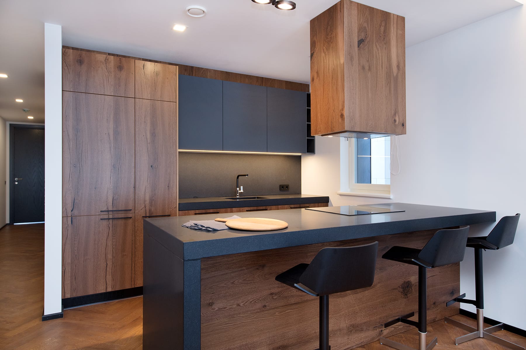 Kapiuksed – värvitud mdf, tööpind – looduskivi Jura Gray Blue; tootja Wesse