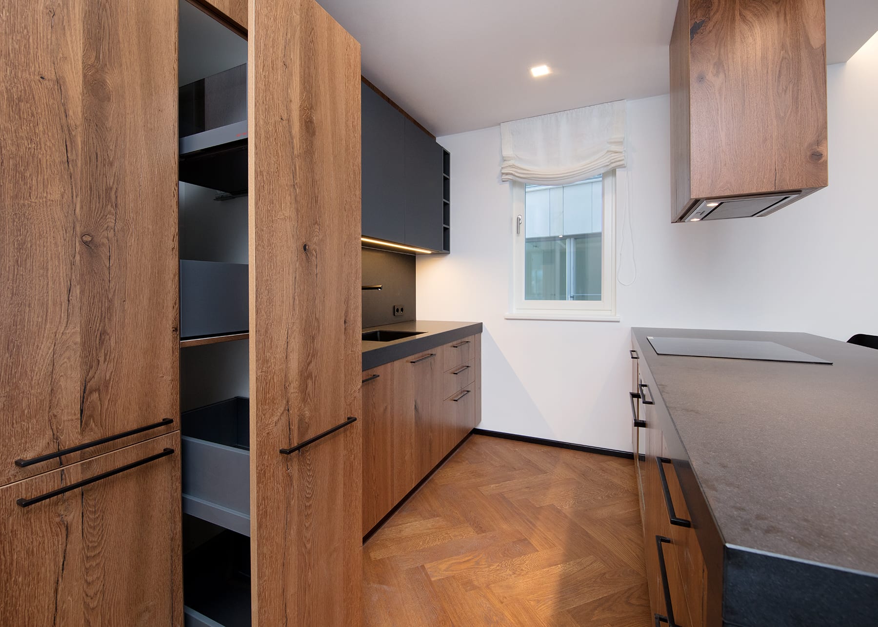 vanutatud tammespoonist uksed, tumehall kunstkivist tööpind; harjatud roostevaba köögitehnika; tootja: Arens