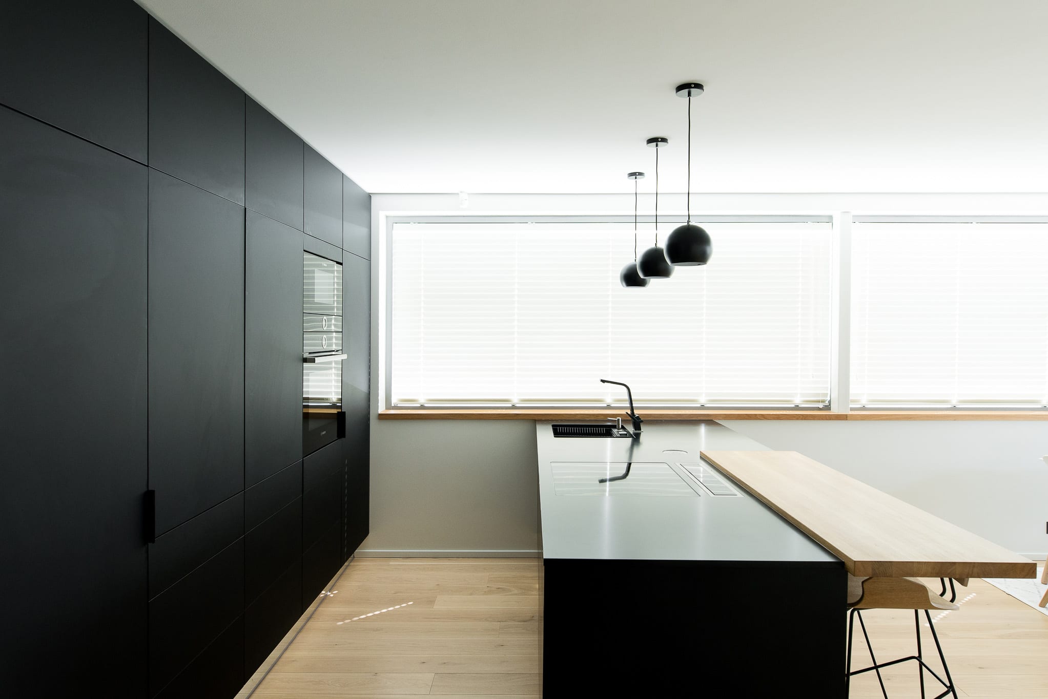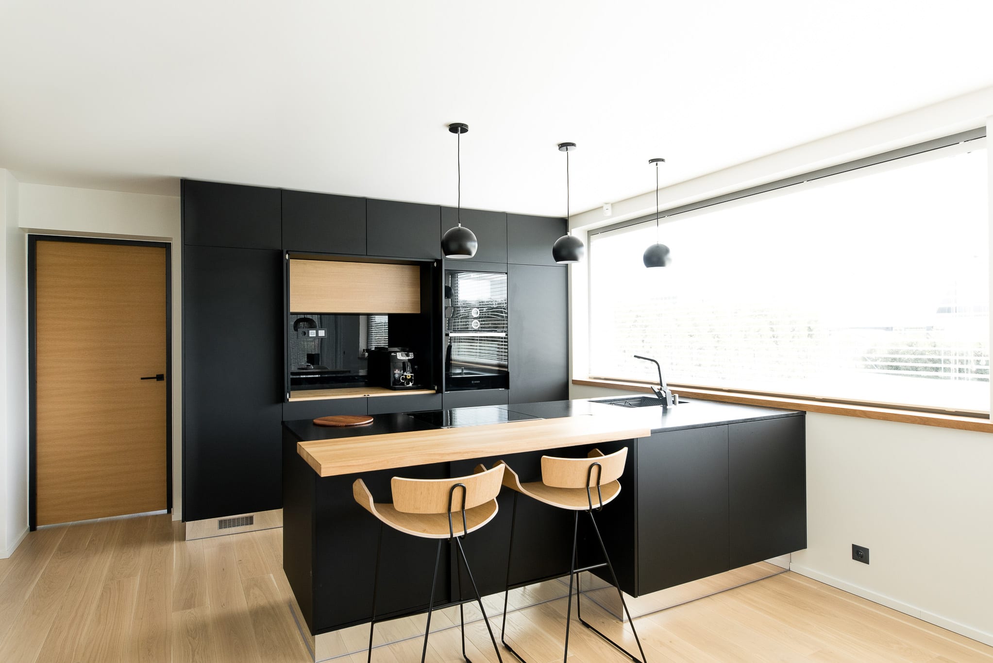 matt-mustad kapiuksed, looduskivist tööpind, must köögitehnika; köögil on peituste taga lisatööpind; tootja: Andi Mööblikoda